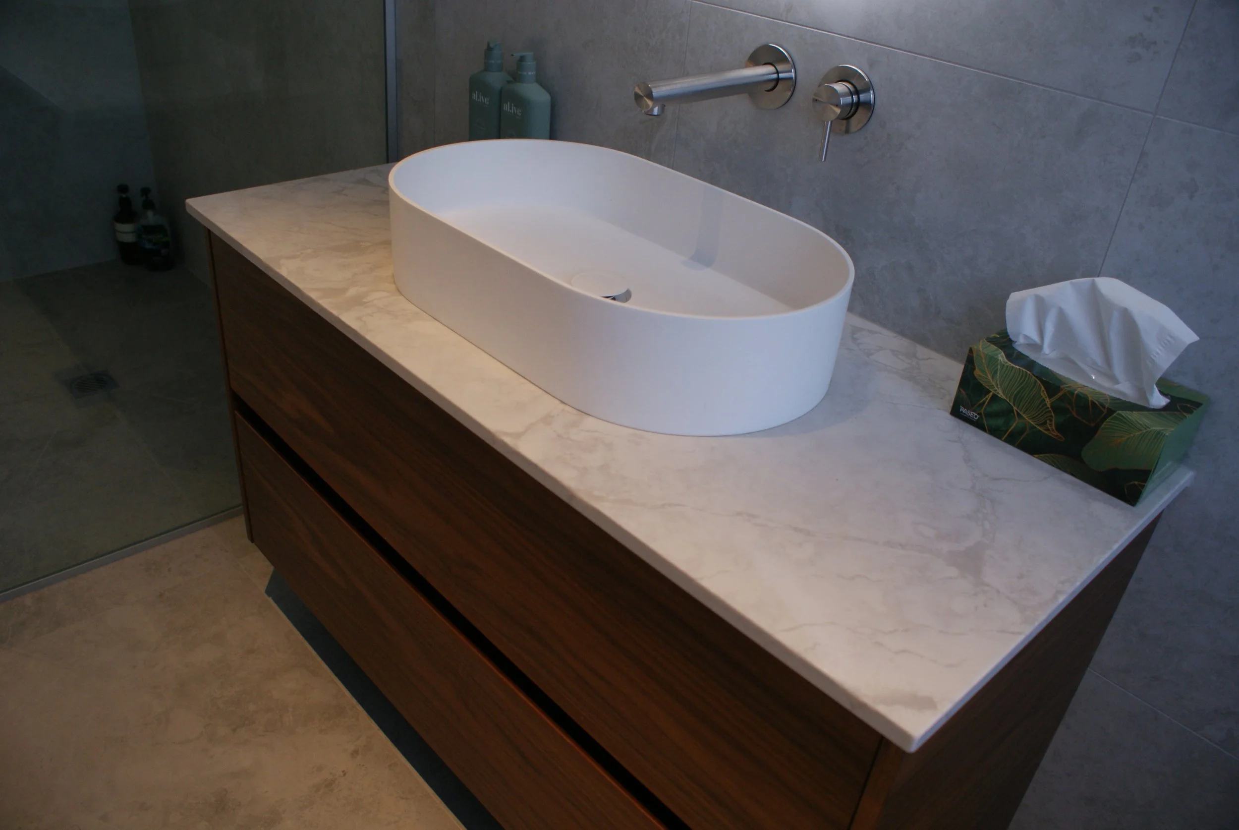 Beautiful stone benchtops and splashback with soft lighting creates a inviting space for all the family to gather.